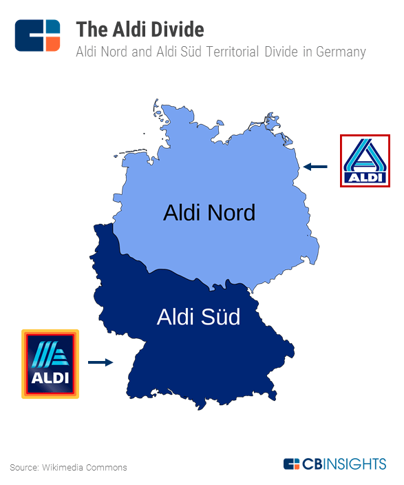 The two companies divided Germany into two operational territories, with Aldi Nord headquartered in Essen, and Aldi Süd in Mülheim.